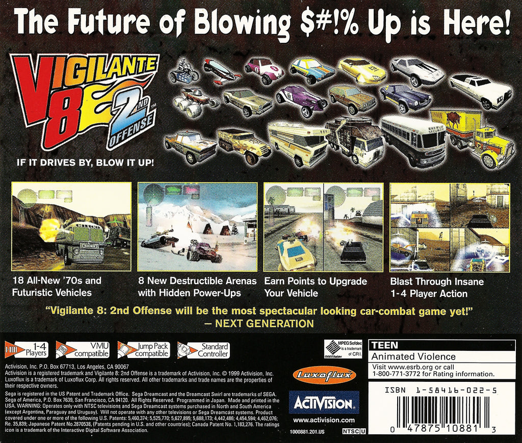 Experience the thrill of Vigilante 8 2nd Offense, the action-packed sequel to the beloved vehicular combat game, now available for the DreamCast. Building on the success of its predecessor, this game offers enhanced graphics, expansive levels, and a dynamic combat system that will keep you on the edge of your seat. Choose from a diverse lineup of uniquely designed vehicles, each equipped with an array of powerful weapons and special abilities, as you navigate through intense battlefields. Whether playing solo or with friends, Vigilante 8 2nd Offense provides endless hours of entertainment, emphasizing strategic gameplay and fast-paced action.