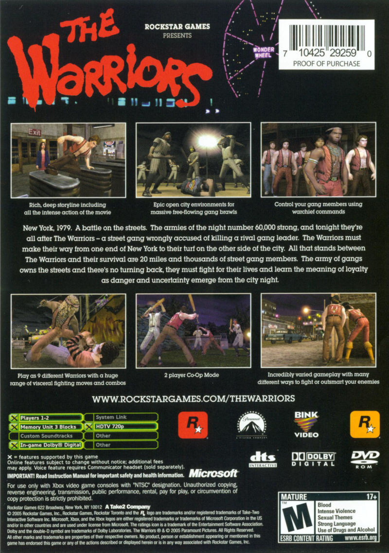 Optimized for Xbox, "The Warriors" harnesses the power of the console to deliver stunning graphics and smooth gameplay. Players can team up in co-op mode to tackle missions together or explore solo as they navigate an authentic, chaotic depiction of New York. Whether you're a fan of the original movie or a newcomer to this cult classic universe, "The Warriors" provides an engaging and nostalgic gaming experience that captures the essence of the streets. Get ready to brawl your way through an unforgettable saga in "The Warriors," a must-have addition to any Xbox collection.
