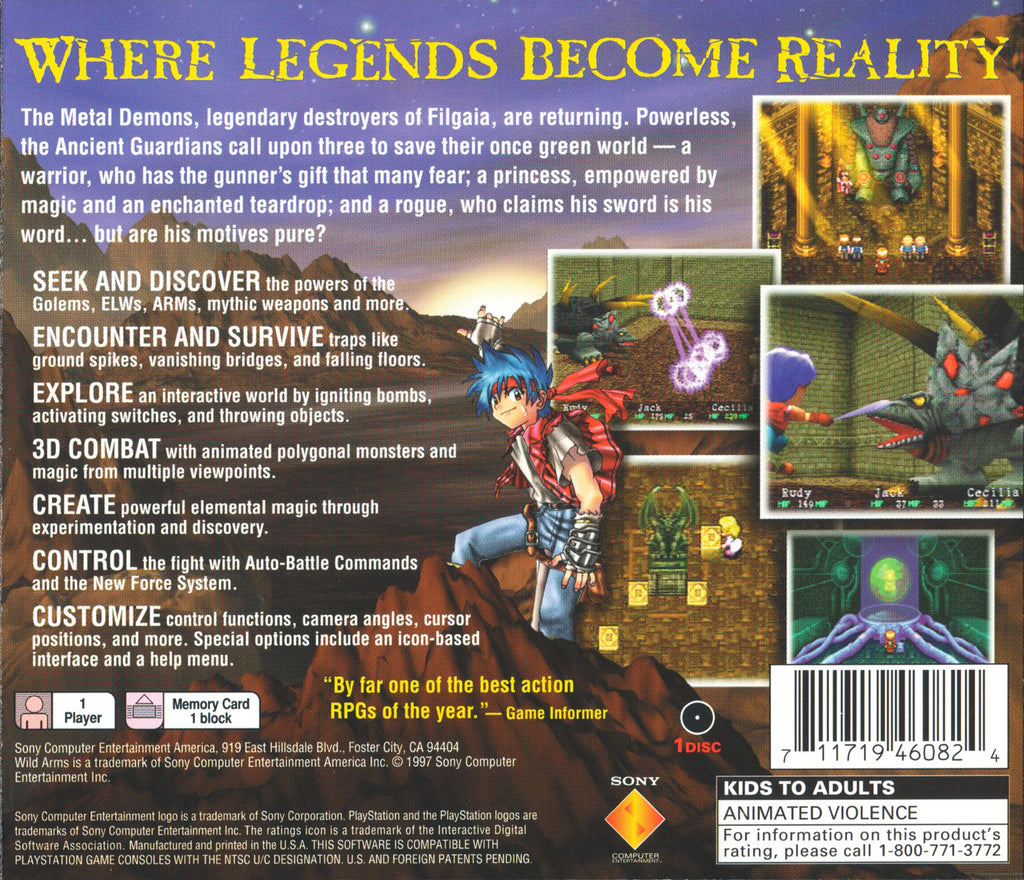 Experience the thrill of adventure as you traverse various landscapes, each filled with challenging puzzles and hidden secrets waiting to be uncovered. "Wild Arms" not only offers a nostalgic trip down memory lane for seasoned gamers but also serves as an accessible entry point for newcomers to the RPG genre. As a PlayStation classic, it delivers an engaging blend of fantasy elements and innovative gameplay mechanics that set the standard for future role-playing games. Whether you're a collector or a first-time player, "Wild Arms" is an essential addition to your PlayStation library. Get ready to embark on an epic quest that has captivated audiences for decades, solidifying its place in gaming history.