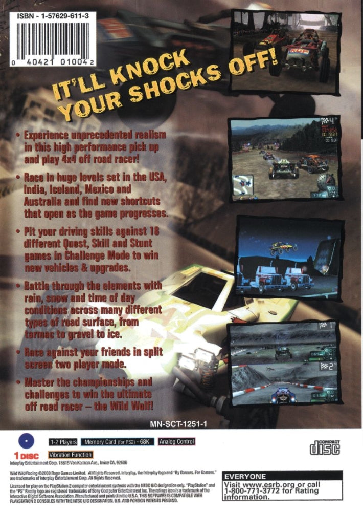 In Wild Wild Racing, you'll have the chance to unlock and drive 21 powerful vehicles, each with distinct handling and performance characteristics. Compete in multiple game modes, including time attack and championship races, to prove your prowess and climb the leaderboards. With its engaging multiplayer options, you can challenge your friends to see who truly reigns supreme on the dirt-strewn paths. Discover the raw thrill of off-road racing with Wild Wild Racing, the perfect addition to your PS2 game collection that promises endless hours of competitive fun.