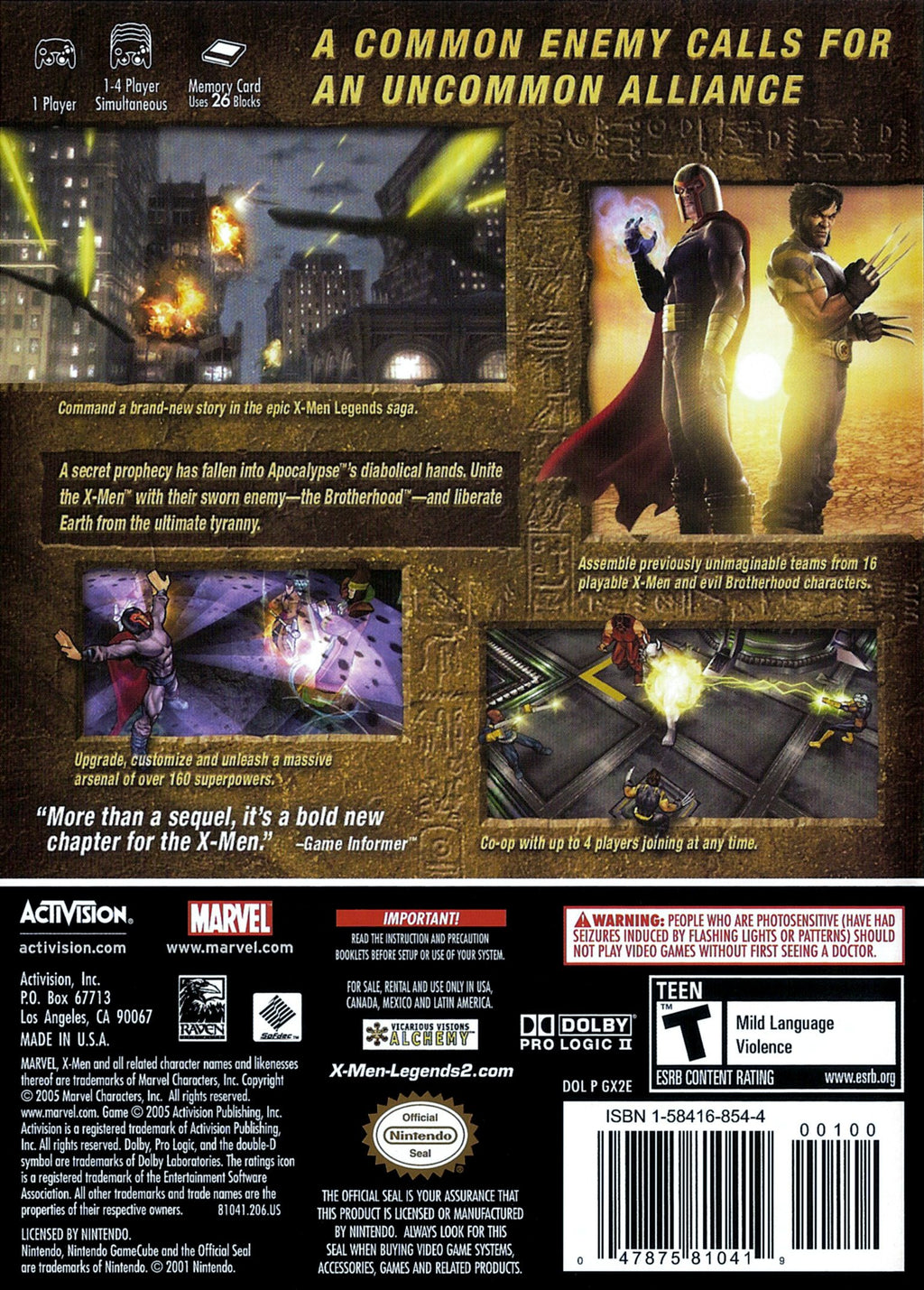 Unleash the power of heroism and villainy with "X-Men Legends II: Rise of the Apocalypse" for the GameCube, where iconic mutants face their greatest challenge. This immersive action RPG brings together the legendary X-Men and their adversaries, the Villains, to form an unprecedented alliance against the menacing Apocalypse. Navigate through richly detailed environments, from the wastelands of Genosha to the hidden recesses of the Savage Land, all while employing unique powers and strategies tailored to each character's abilities. With four-player co-op multiplayer mode, the game encourages teamwork and adds a dynamic layer to the gameplay experience, ensuring endless hours of exhilarating action.